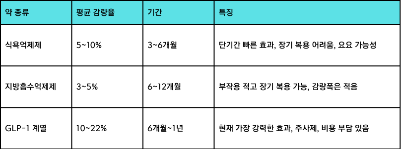 다이어트에 사용되는 약은 크게 3가지 종류로 나눌 수 있고, 각각 효능과 특징이 달라요. 간단하게 정리해볼게요.