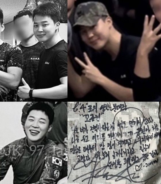 - 2024년 8월, 지민과 정국이 전우의 전역을 축하하기 위해 함께 찍은 사진이 공개되었습니다. 군복을 입고 벌크업된 몸과 늠름해진 모습으로 카메라를 바라보는 지민의 모습이 담겨 있습니다.